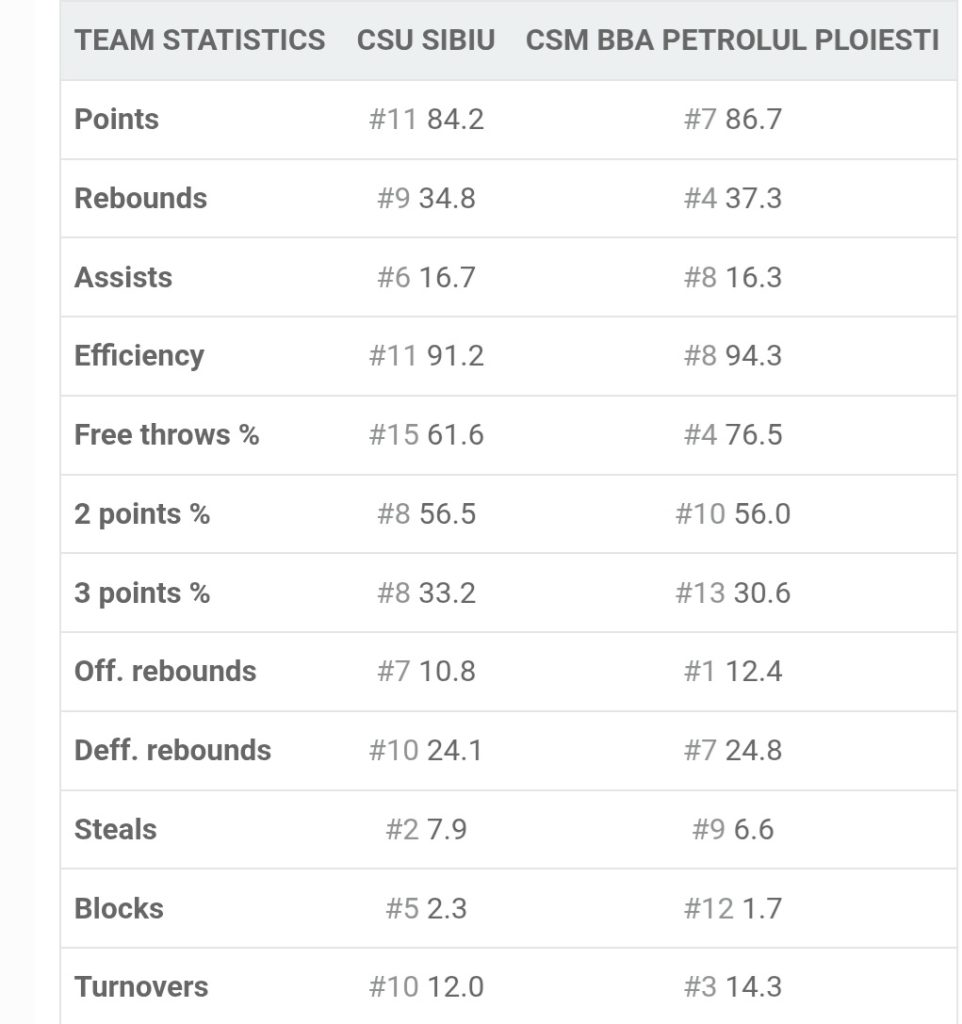 Statistica față în față a celor două echipe nu atrage după sine o favorită certă. Ploieștenii sunt „top class” la recuperări, mai ales cele ofensive, fiind mai eficienți și marcând mai multe puncte decât adversarul de mâine seară. Totuși, Sibiul excelează la agresivitate defensivă, prin capace și intercepții, dar și la reușitele de la două și trei puncte. În același timp, mai ales cu atmosfera din Sala „Transilvania” în ceafă, prahovenii pot pierde multe mingi, asta și din cauza faptului că deja ocupă ultima treaptă a podiumului echipelor care pierd cele mai multe mingi.