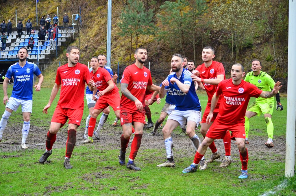Ieri, la Rășinari, în fața a 150 de spectatori, Vlad Munteanu a deschis scorul pentru Agnita în minutul 40 după o greșeală uluitoare a portarului Comăniciu, ”sabotat” și de noroi. Portarul Rășinariul a încercat să paseze pe jos, cu mâna, spre cel mai apropiat fundaș, dar Munteanu, pe fază, a interceptat mingea oprită în noroi, a pătruns pe stânga șutând violent din 7 metri.