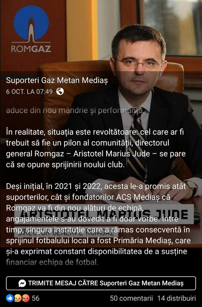 „Ping-pong-ul” dintre suporteri medieșeni și Romgaz/Transgaz pare că nu ajunge nicicum la o minge de meci, de mai bine de 3 ani. Dar, pentru prima dată după mulți ani, Romgaz le-a răspuns fanilor pe pagina fanilor, chiar în rubrica de comentarii, într-o postare care îl viza pe directorul general al companiei de stat, Aristotel Marius Jude, acuzat direct că s-ar opune sprijinirii clubului ACS Mediaș.