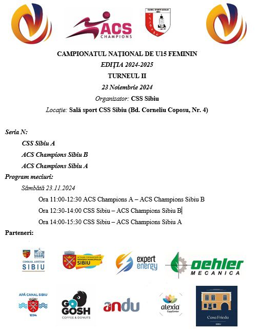 Sâmbătă, 23 noiembrie, iubitorii voleiului din Sibiu sunt invitați la un eveniment deosebit: Turneul 2 al grupei N din cadrul Campionatului Național de Volei Feminin U15. Competiția, organizată de CSS Sibiu, aduce în fața fileului cele trei echipe locale: ACS Champions Sibiu A, ACS Champions Sibiu B și CSS Sibiu. Turneul se va desfășura în Sala Sporturilor CSS Sibiu, iar intrarea este liberă.